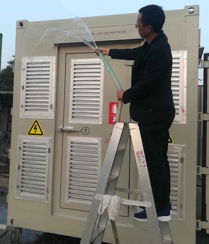 在新風(fēng)機(jī)柜清洗前,我們先鋪好隔墊防止地面積水,水箱裝水待用;關(guān)機(jī)斷電保證后續(xù)清洗工作安全。